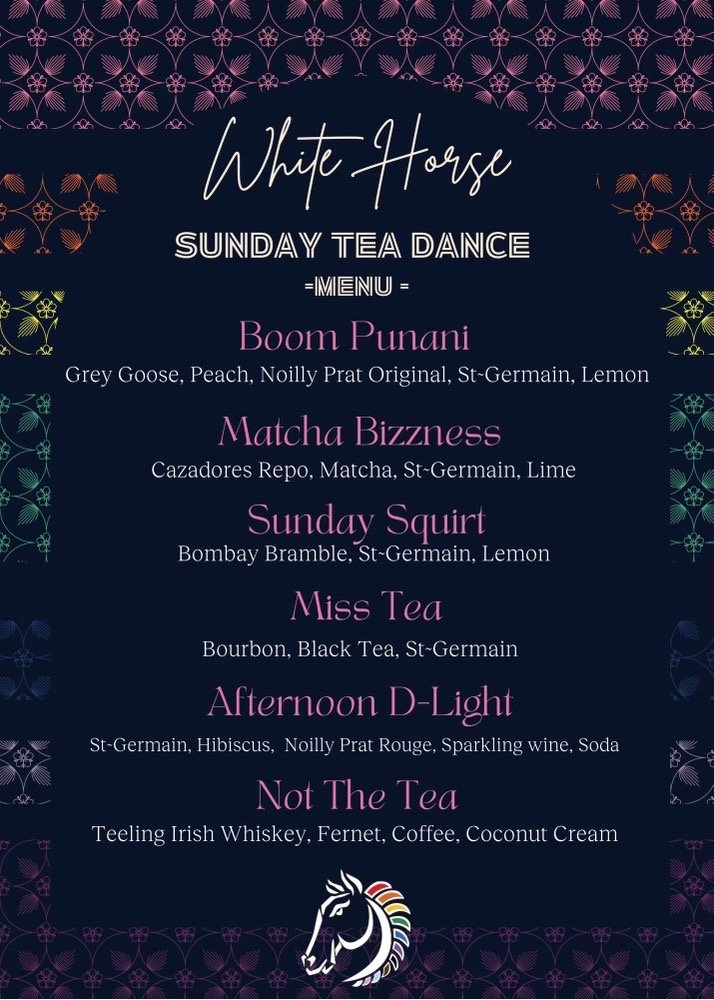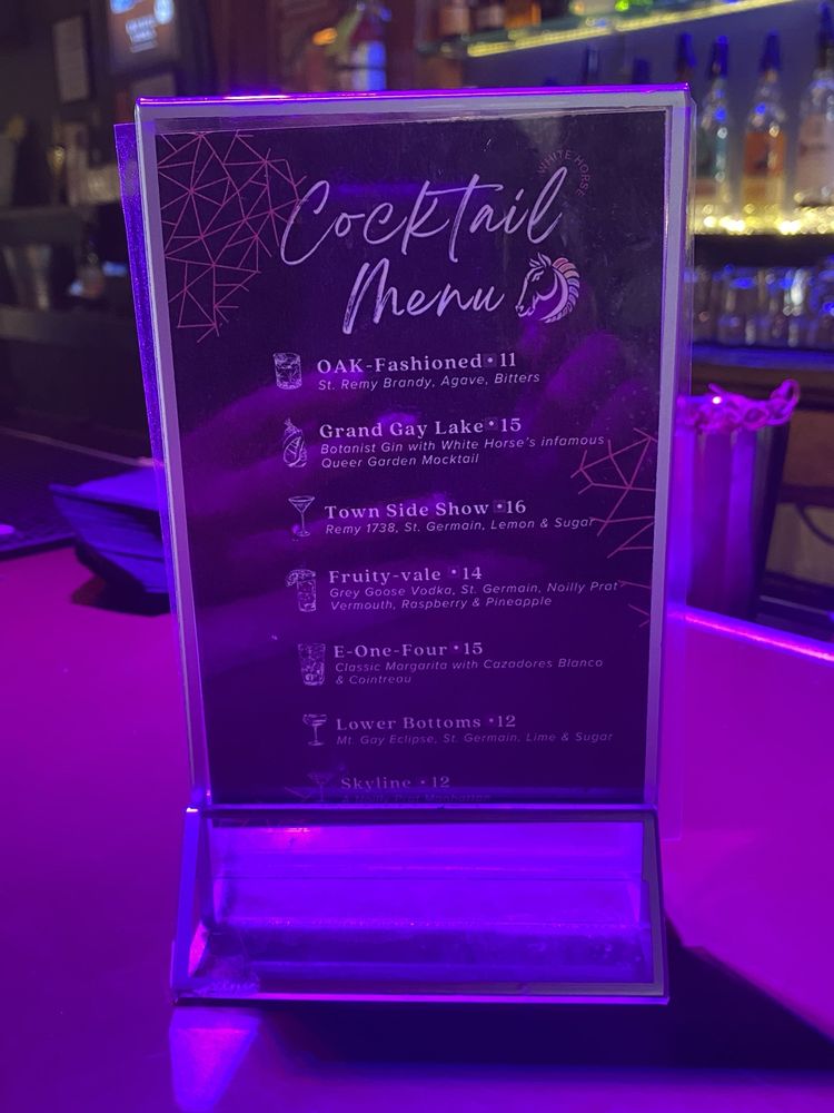 Introducing the menu at White Horse Bar, the oldest operating gay bar in the country located in Oakland, CA. This LGBTQ-owned establishment offers a casual and inclusive atmosphere with features like outdoor seating, gender-neutral restrooms, and a heated outdoor space. The menu boasts happy hour specials, a full bar, and Asian, Black, and women-owned business pride. Customers praise the diverse and welcoming vibe, with one mentioning the amazing food and overall experience. Enjoy a range of options while taking in the vibrant scene on the best nights of Friday, Saturday, and Sunday. Whether you're looking for a place to dance, play pool, or simply relax with friends, White Horse Bar provides a memorable setting for a good time.